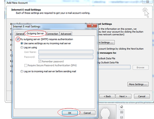نحط اشارة على خيار My Outgoing server (SMTP ) requires authentication